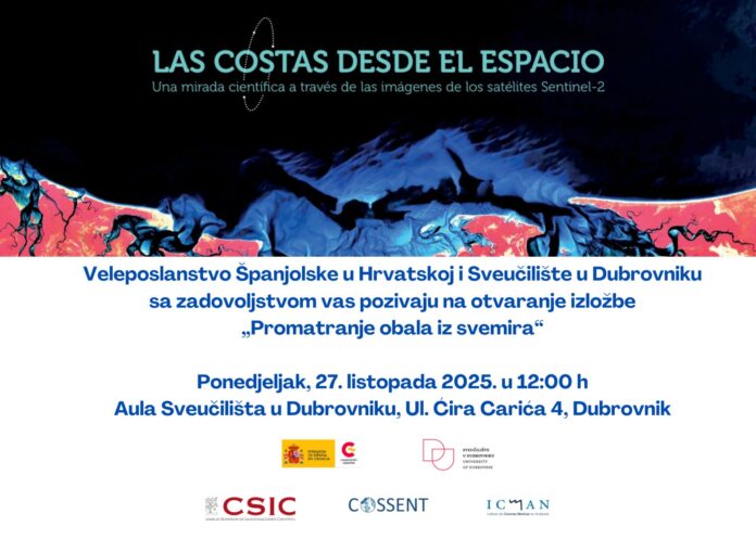 Sveučilište u Dubrovniku od 27. listopada do 24. studenoga 2025. bit će domaćin međunarodne izložbe „Promatranje obala iz svemira: znanstveni pogled na obale pomoću snimki sa satelita Sentinel-2“, koja posjetiteljima pruža priliku da istraže i razumiju obalne ekosustave kroz dojmljive slike snimljene iz svemira. Izložba se organizira u suradnji Veleposlanstva Kraljevine Španjolske u Hrvatskoj i Sveučilišta u Dubrovniku, uz potporu Španjolskog nacionalnog vijeća za znanstvena istraživanja (CSIC), Instituta za morske znanosti Andaluzije (ICMAN-CSIC) i drugih španjolskih znanstvenih institucija.