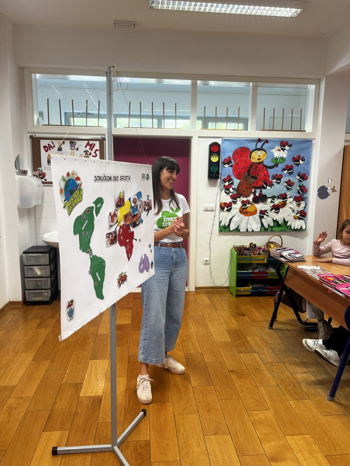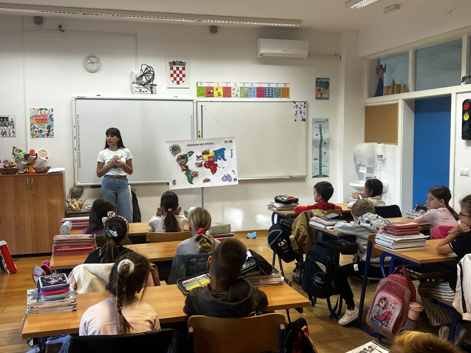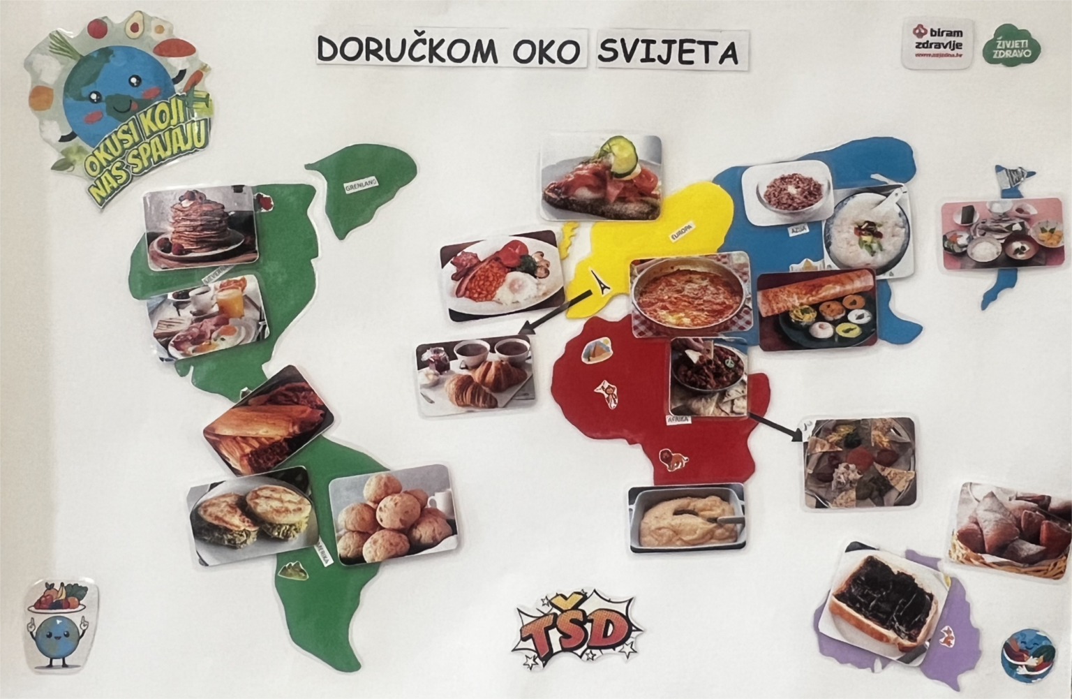 Tijekom radionice „Doručkom oko svijeta“, djeca su se upoznala s različitim vrstama doručaka koji se poslužuju u svijetu. Na zabavnom „putovanju“ po kontinentima saznala su što jedu djeca u Francuskoj, što čini tradicionalni engleski doručak, gdje se za doručak jede juha ili riba, a gdje žitne kaše. Posebno zanimanje izazvao je mediteranski tip doručka, pri čemu su učenici sami nabrajali namirnice karakteristične za mediteransku prehranu, koje daju puno energije i važnih hranjivih tvari za očuvanje zdravlja. Djeca su tijekom radionice naučila i da je jedan od postulata pravilne prehrane raznolikost, što znači da je važno isprobavati nova jela i kombinacije namirnica. Kako bi se potaknula ta navika, drugi dio radionice uključivao je “Hrabri izazov”, zadatak za domaći rad u kojem su učenici dobili četiri različita recepta te su kod kuće, zajedno s roditeljima, trebali pripremiti jedno jelo i ocijeniti njegov izgled, miris, okus te dati ocjenu za ukupan dojam jela. Radionica je završila veselim kvizom “Okusi koji spajaju”, u kojem su djeca, uz kotač znanja i kartice s pitanjima, pokazala koliko su naučila o pravilnoj prehrani, uravnoteženom doručku i prehrambenim navikama djece širom svijeta.