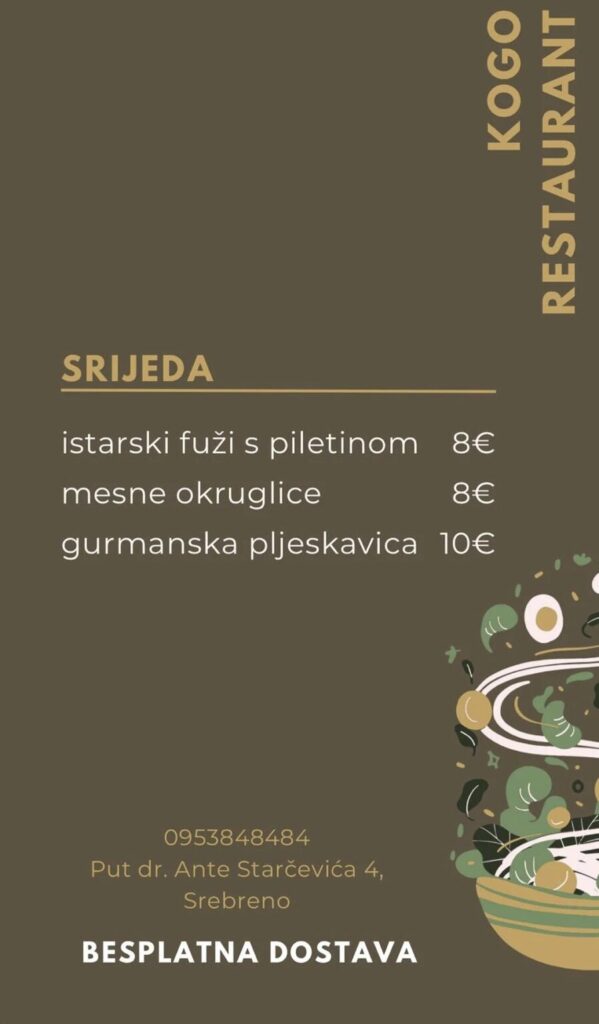 Restoran KOGO, Srebreno, Župa dubrovačka – 095 384 8484, 095 596 8873, moguća dostava