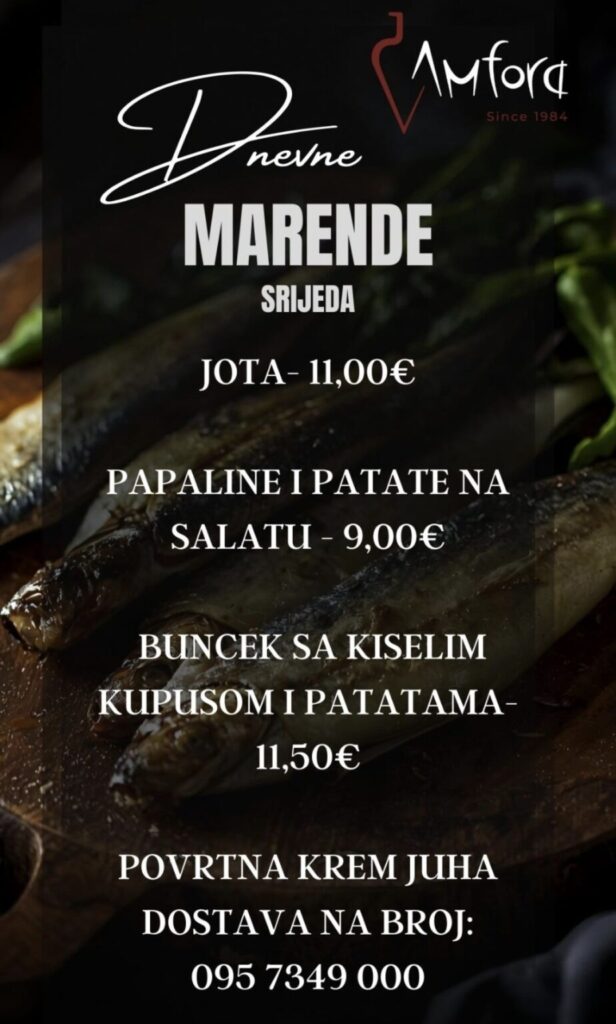 Restoran Amfora, Obala Stjepana Radića 26, Gruž, kont. 098 933 6158, ne vrše dostavu, moguće preuzimanje u restoranu