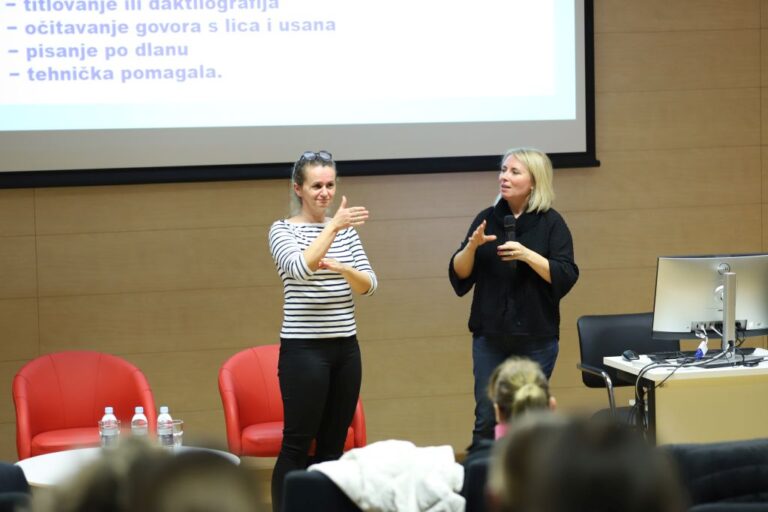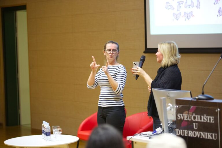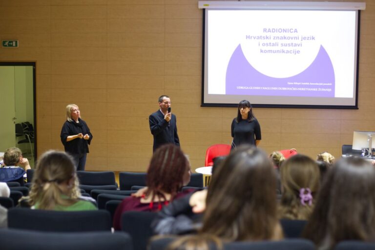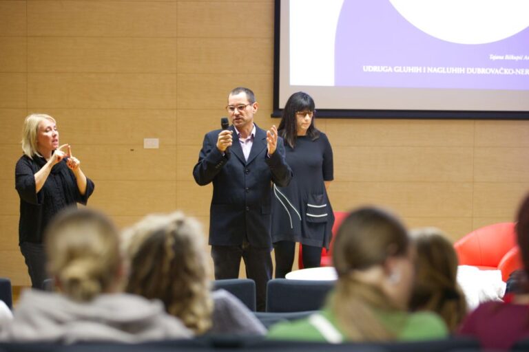 Uslijedilo je predavanje „Izazovi i podrška: iskustva gluhih studenata“, koje su održali Ivona Katušić i Vedran Kastrapeli iz Udruge gluhih i nagluhih Dubrovačko-neretvanske županije. Podijelili su vlastita iskustva iz školovanja i svakodnevnog života te opisali najčešće prepreke s kojima se gluhe i nagluhe osobe suočavaju. O važnosti dostupnosti tumača i osnovama komunikacije govorila je komunikacijska posrednica Tajana Biškupić Andolšek, koja je sudionicima predstavila osnove znakovnog jezika.