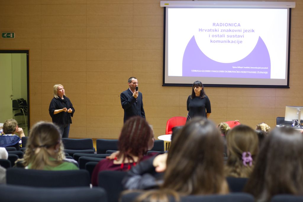 Uslijedilo je predavanje „Izazovi i podrška: iskustva gluhih studenata“, koje su održali Ivona Katušić i Vedran Kastrapeli iz Udruge gluhih i nagluhih Dubrovačko-neretvanske županije. Podijelili su vlastita iskustva iz školovanja i svakodnevnog života te opisali najčešće prepreke s kojima se gluhe i nagluhe osobe suočavaju. O važnosti dostupnosti tumača i osnovama komunikacije govorila je komunikacijska posrednica Tajana Biškupić Andolšek, koja je sudionicima predstavila osnove znakovnog jezika.