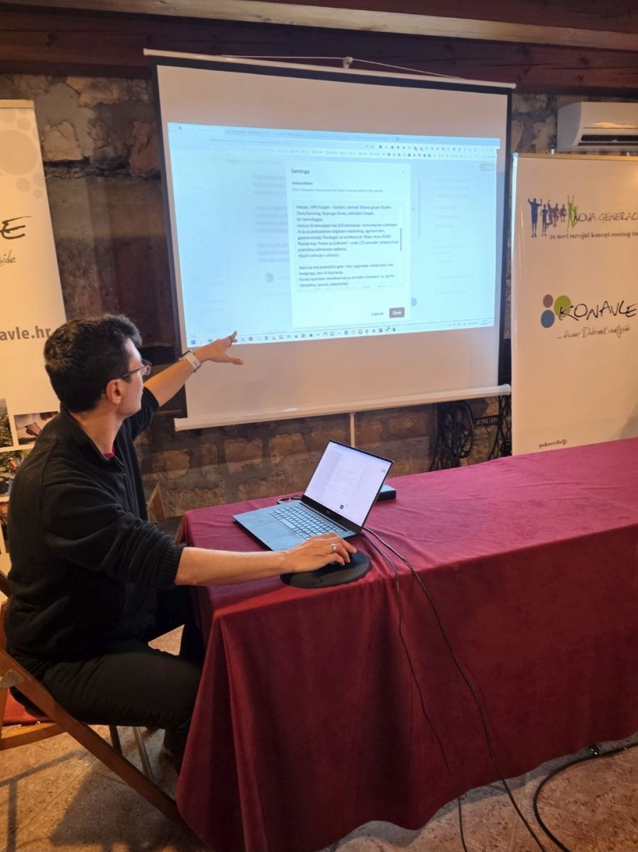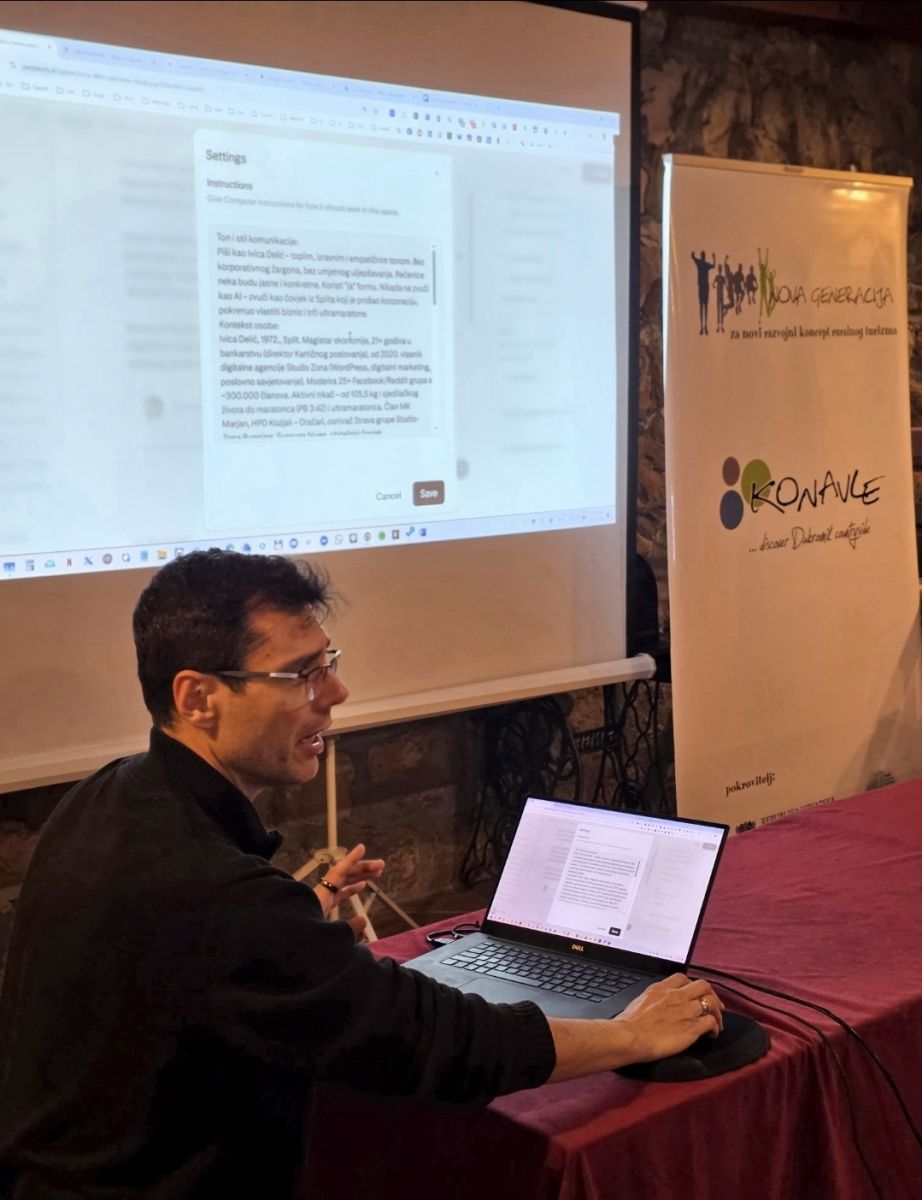 Predavanja je organizirao Agroturizam Konavle, uz pokroviteljstvo Ministarstva turizma i sporta kroz projekt Nova generacija 3, a vodio ih je AI konzultant i edukator Ivica Delić. Tijekom dva dana sudionici su upoznali ključne alate umjetne inteligencije, načine oblikovanja kvalitetnih upita te praktične modele primjene AI-ja u marketingu, prodaji, komunikaciji i poslovnoj operativi.