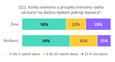 Kada je riječ o učestalosti rada na daljinu, većina zaposlenih, bez obzira na spol, odrađuje do 5 dana mjesečno izvan ureda (54% muškaraca i 50% žena). No, razlike postaju izraženije pri duljim periodima rada od kuće: gotovo trećina žena (28%) radi 11 ili više dana mjesečno na daljinu, u usporedbi s tek 15% muškaraca. To upućuje na to da žene u većoj mjeri koriste produžene oblike fleksibilnog rada.