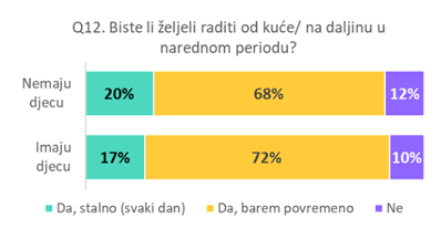 Podaci istraživanja pokazuju da većina zaposlenih, bez obzira na roditeljski status, želi imati mogućnost rada od kuće ili na daljinu barem povremeno. Ipak, određena razlika se primjećuje kada se usporede roditelji i zaposleni bez djece, pa tako 72% roditelja želi ovakav oblik rada, dok je među onima bez djece taj udio nešto niži i iznosi 68%.