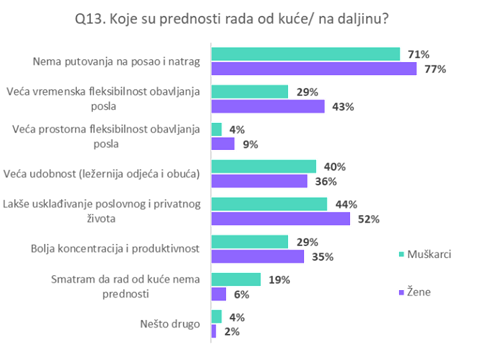 Kada govorimo o prednostima rada od kuće, ispitanici oba spola najčešće ističu izbjegavanje putovanja na posao i lakše usklađivanje poslovnog i privatnog života. Žene ipak nešto češće naglašavaju ove aspekte (77% i 52%) u odnosu na muškarce (71% i 44%). Među prednostima se ističe i veća vremenska fleksibilnost, koju navodi 43% žena i 29% muškaraca, dok se prostorna fleksibilnost pokazala manje važnom, ali ipak češće spominjanom kod žena (9%) nego muškaraca (4%).