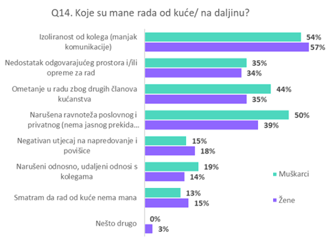 Među najčešće spominjanim manama rada od kuće nalaze se izoliranost od kolega i narušena ravnoteža poslovnog i privatnog života. I dok žene nešto češće ističu osjećaj izoliranosti (57% u odnosu na 54% muškaraca), muškarci pak češće naglašavaju poteškoće u održavanju ravnoteže (50% naspram 39% žena). Nedostatak odgovarajućeg prostora i/ili opreme za rad podjednako je prisutan problem za oba spola (35% muškaraca i 34% žena).