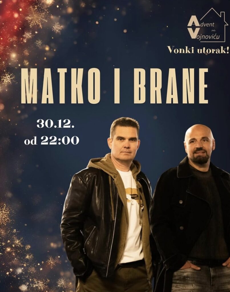 Matko i Brane, večeras nastupaju na Adventu na Vojnoviću, ispred Studentskog centra Dubrovnik. Uvod u dobru noć na Stradunu su Prijatelji dubrovačkog distonavanja i šperploče te Željko Bebek, a Vojnović je finale gdje zabava traje do 2:00.