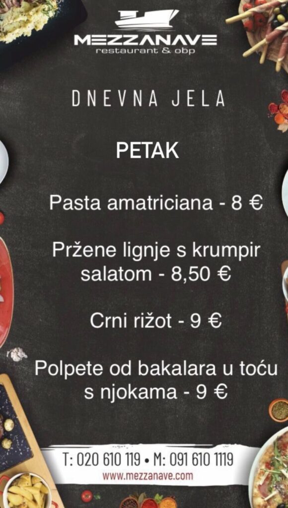Restoran Mezzanave, Dr. Ante Starčevića 24, telefoni: 020 610 119, 091 610 1119, moguća dostava