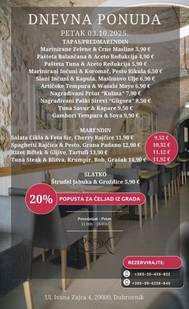 Imate ponudu dnevnih marendi, i želite ih promovirati na dubrovniknetu?! Javite se s povjerenjem na marketing@dubrovniknet.hr ili na 091 344 6000