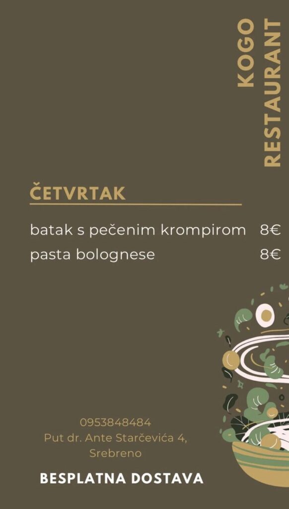 Restoran KOGO, Srebreno, Župa dubrovačka – 095 384 8484, 095 596 8873, moguća dostava