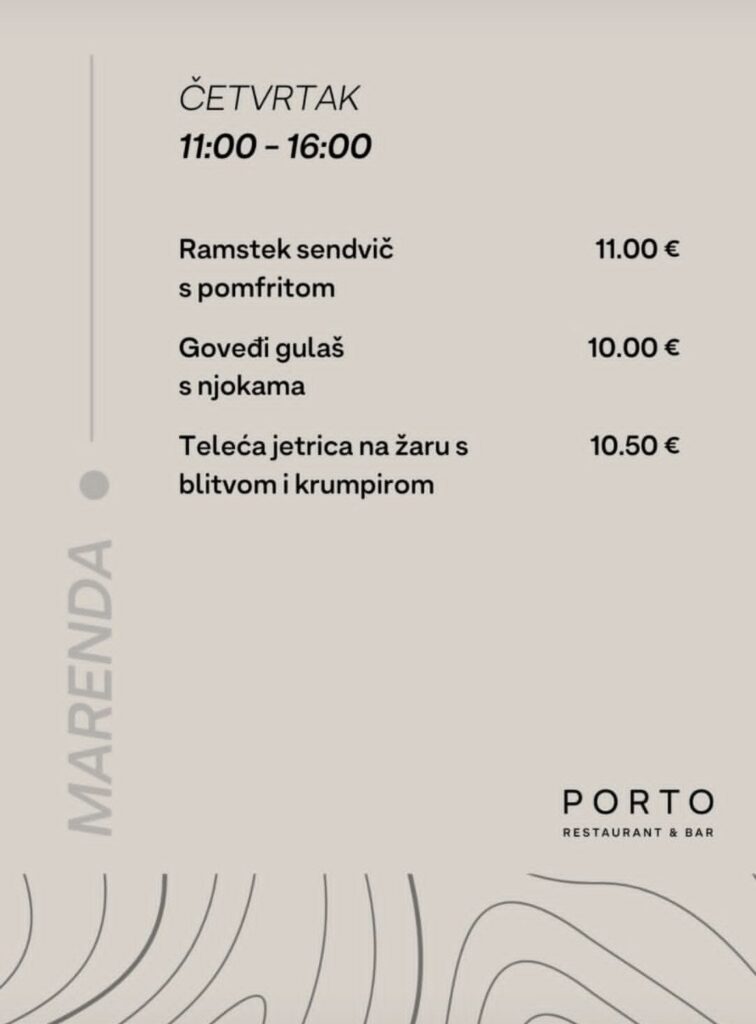 Bar & Restoran Porto, Hrvatskog Crvenog Križa 2, Dubrovnik, kont. 020 301-450, ne vrše dostavu, moguće preuzimanje u restoranu
