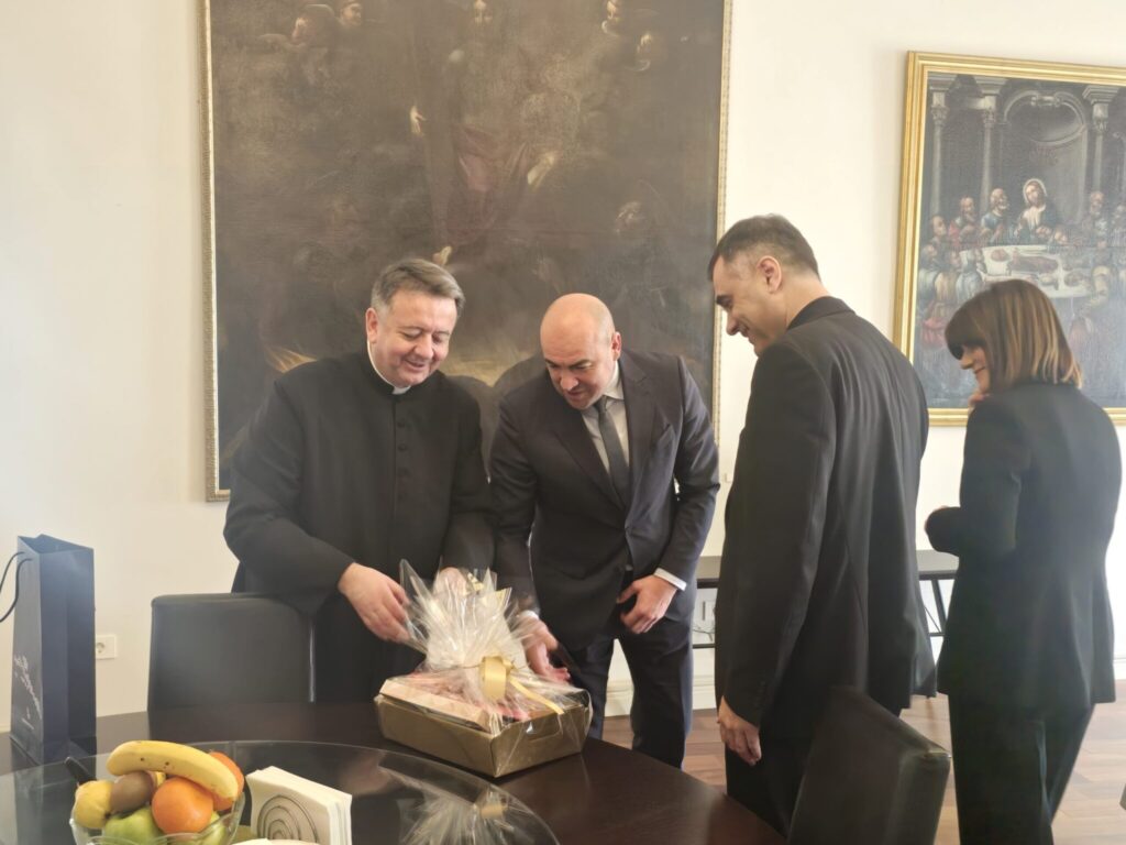 Župan Blaž Pezo i pročelnica Upravnog odjela za obrazovanje, kulturu i sport Jelena Dadić Račić susreli su se danas, ususret blagdanu Uskrsa, s biskupom dubrovačkim Rokom Glasnovićem i generalnim vikarom don Ivicom Pervanom.