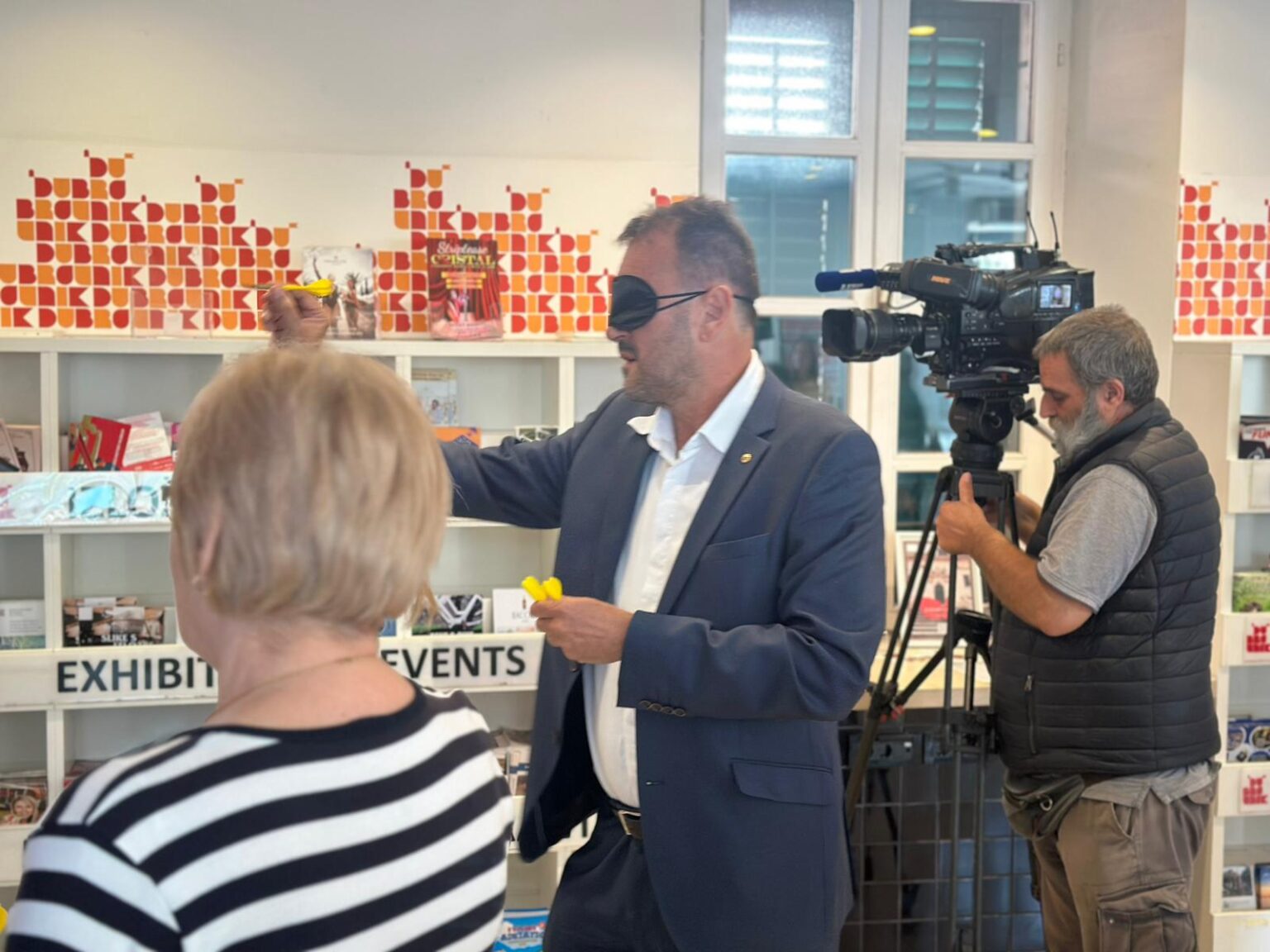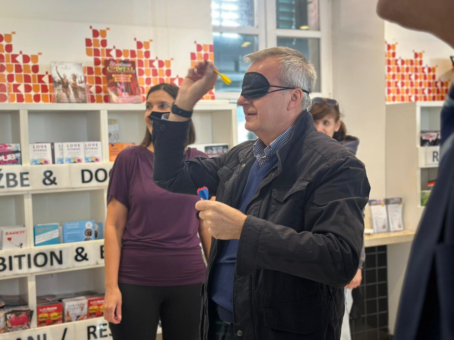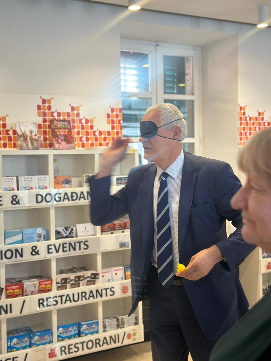 Naši sugrađani imali su priliku zaigrati zvučni pikado s povezom na očima, na taj način pridonijeti podizanju svijesti, empatiji i razumijevanja prema ovoj skupini naših sugrađana, te donirati za kupnju pametnog WeWalk štapa za slijepe, koji je ove godine namijenjen našoj sugrađanki Elly Radić.